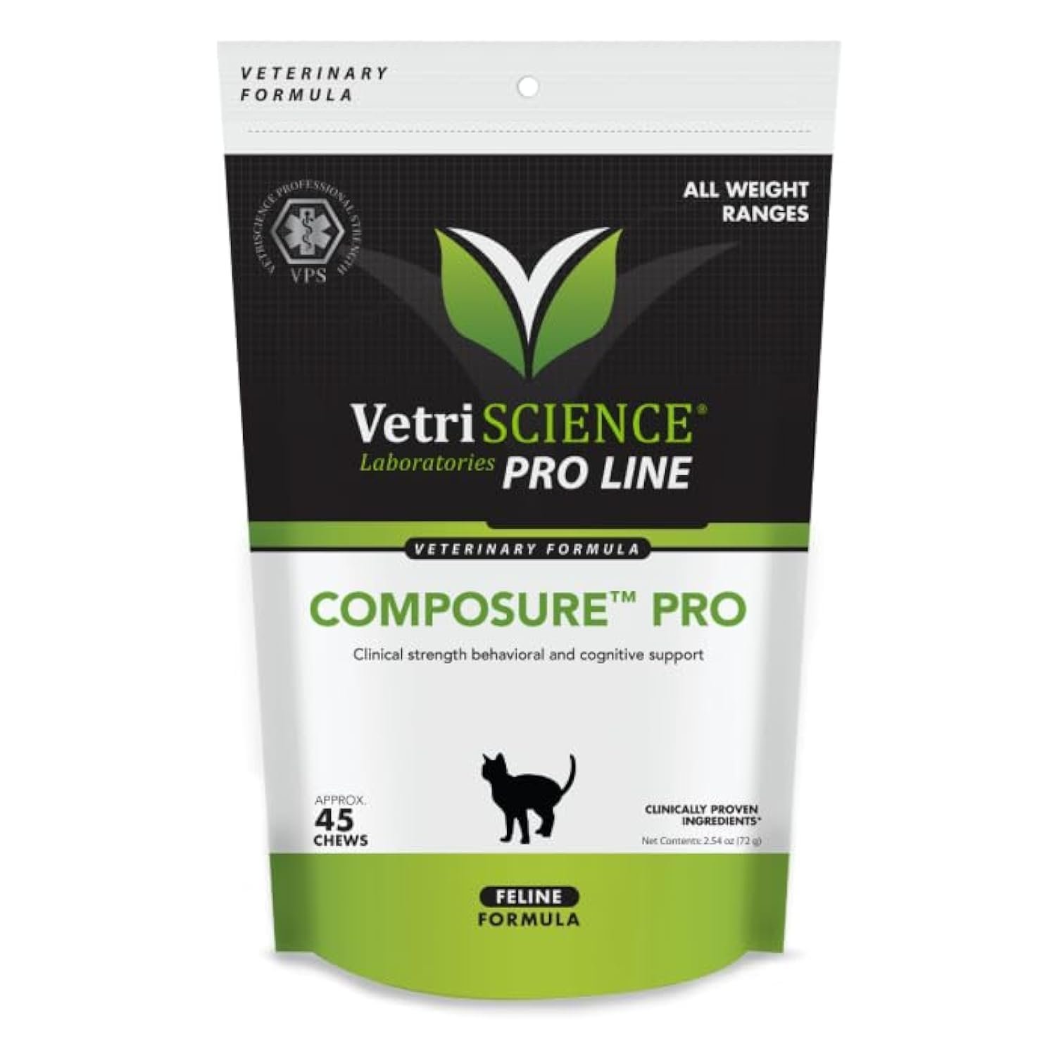 Composure Pro feline is specifically formulated for cats to provide advanced behavioral and cognitive support. Composure Pro feline formula is a clinical strength calming supplement for cats. It typically works within 30 minutes and lasts up to 4 hours. Composure Pro combines four effective including Colostrum Calming Complex, L-theanine and L-tryptophan to provide advanced behavioral and cognitive support. Composure Pro is recommended for traveling, thunderstorms, fireworks, veterinary visits and routine changes. These chicken liver-flavored chews are perfectly sized for cats with added flavoring for picky eaters. Directions for Use: Give 1-2 chews daily. Product can be given up to two times daily, or on an as-needed basis. It is safe to double in times of increased stress. Active Ingredients per 1 Chew (1.6 g): Thiamine (Vitamin B1) 50 mg L-Tryptophan 37.5 mg Colostrum Calming Complex Biopeptide Blend 12.5 mg L-Theanine (Suntheanine Brand) 12.5 mg