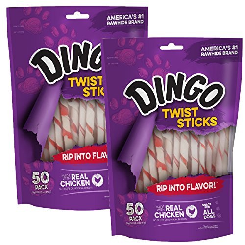 Dingo Twist Sticks are the only rawhide twists with real chicken meat in the middle. The twist sticks are the perfect treating size for many sizes of dogs.