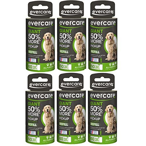 The Evercare Giant Pet Hair Lint Roller is a must have for pets, your home and auto lint problems. Keep your clothes, car and home furnishings looking their best with the Evercare Pet Giant Lint Roller Refills. With extra sticky, extra large sheets, it works quickly and easily to pick up lint, pet hair, dust and dandruff from virtually any surface. Works on most materials, clothing, upholstery, carpeting, drapes, auto interiors, bedspreads and window screens. The tape is removed easily and without waste. Comes in a 6 pack, each roller refill includes 60 sheets. To use: Remove cover and save for re-use. Roll lint roller over surface to be cleaned. When the tape is full, lift dry edge of tape at slit, peel off used layer and discard. To change refills: Simply pull the handle out of the empty roll and firmly push into new refill roll.