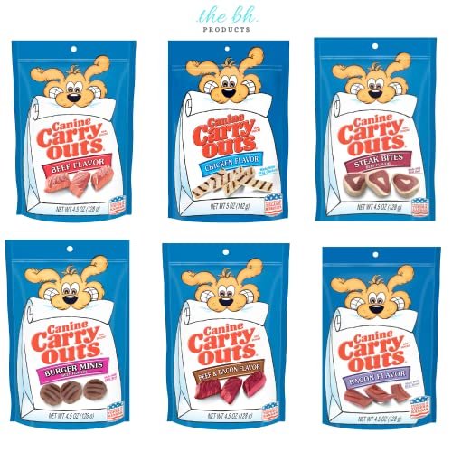 The BH Products Canine Carry Outs Variety 6 Pack Bundle with Chicken, Bacon, Beef & Bacon, Burger Minis, Steak Bites, and Beef Flavors Sticker